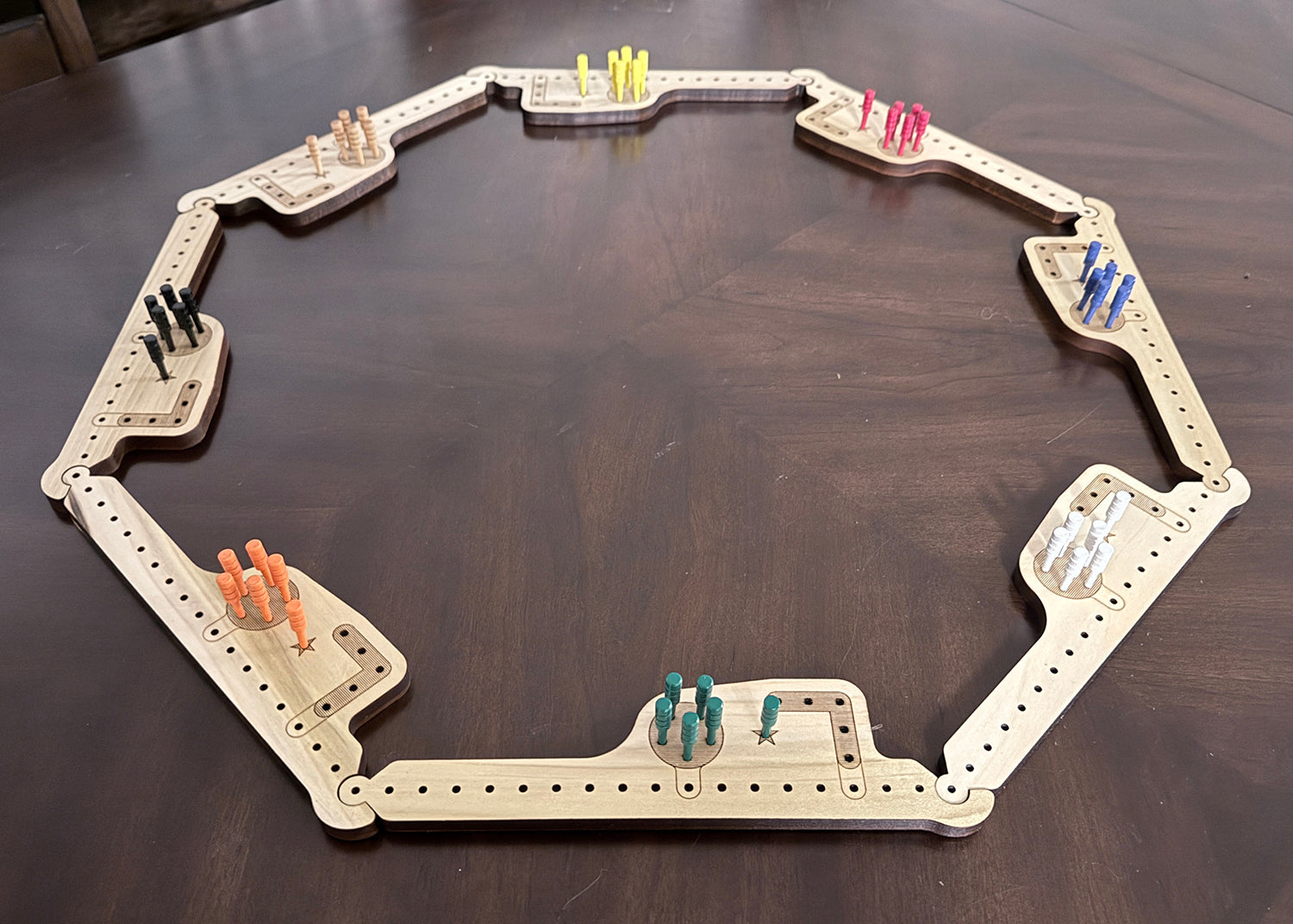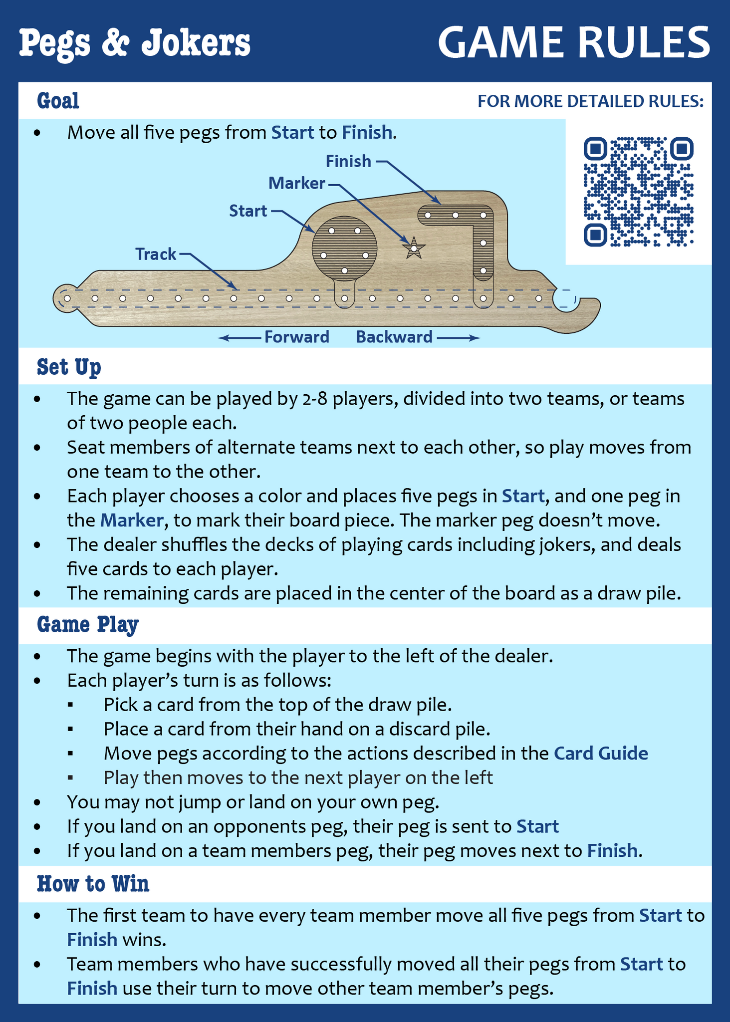 Precision-cut hardwood game boards, carefully sanded and finished for smooth play. Suitable for 2–8 players, with richly colored pegs that make it easy to see each player’s position at a glance. Includes 8 boards, 48 cribbage pegs in 8 colors, game instructions, and a storage bag. Each board measures approximately 10" x 2.5" x 0.375".